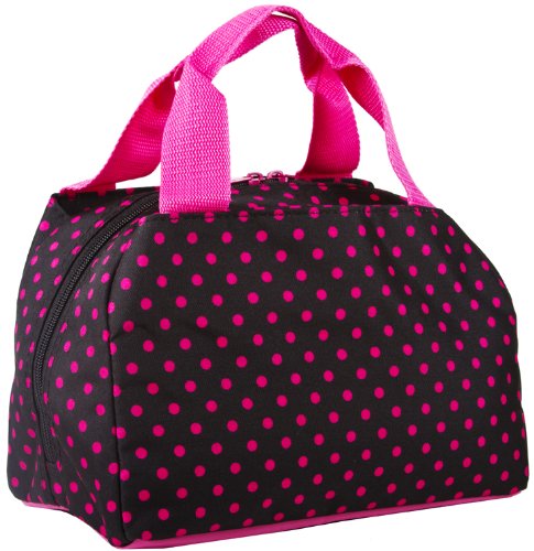 Keep food hot or cold till lunchtime with this reusable lunch tote! Eating out can be expensive and doesn't always provide the healthiest options. Save money and eat better by taking food from home! Made of hard wearing microfiber in trendy black and hot pink polka dot with hot pink handles, this lunch box features a zip top closure and two exterior velcro pockets perfect for storing utensils, wet naps, or small snacks. The silver insulated interior is fully lined for easy cleanup of accidental spills and ensures against leaks. Makes a stylish school lunch box for small children, tweens or older! Its compact size fits nicely inside a backpack, but is still spacious enough to hold all your lunchtime necessities. Use as a small cooler for summer picnics, to keep drinks cool at outdoor sports practices, or just to showcase your personality whenever you're taking food and drinks on the go.