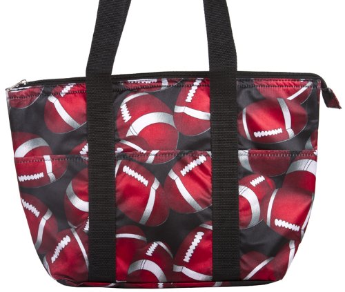 Keep food hot or cold till lunchtime with this reusable lunch tote! Eating out can be expensive and doesn't always provide the healthiest options. Save money and eat better by taking food from home! Made of hard wearing microfiber in a fun football print with black shoulder straps, this lunch box features a zip top closure and three exterior pockets perfect for storing utensils, wet naps, or small snacks. The silver insulated interior is fully lined for easy cleanup of accidental spills and ensures against leaks. Makes a stylish school lunch box for small children, tweens or older! Use as a small cooler for summer picnics, to keep drinks cool at outdoor sports practices, or just to showcase your personality whenever you're taking food and drinks on the go.