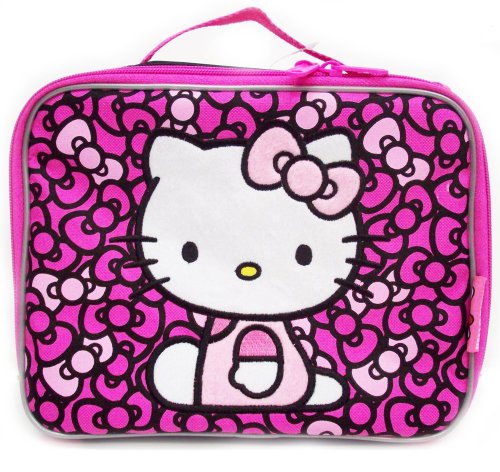 - Black insulated lunch box with images of Hello Kitty in front of a backdrop of pink bows