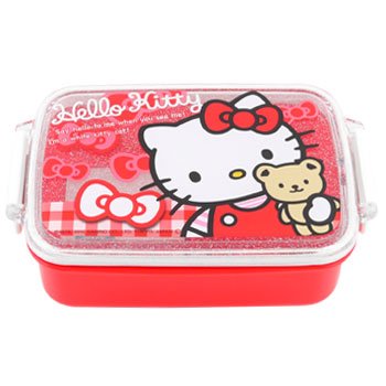 Make lunch a fun occasion with this Hello Kitty and teddy bear lunch box. Top is transparent with silver sparkles. Text reads: 'Say hello to me when you see me! I'm a white cat!' A convenient removable divider separates food items. Lid has leak proof seal that locks into place. Can hold up to 450ml / 15.22fl oz.