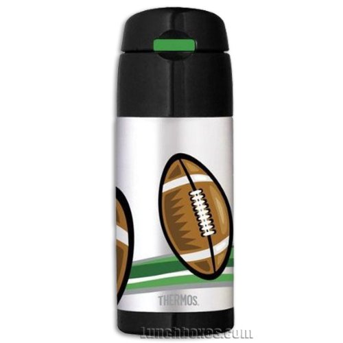 This great looking insulated stainless steel drink thermos shows footballs on the front and backside. It'll make a perfect gift for your Pop Warner player or your little football fan. Features : • TherMax double wall vacuum insulation for maximum cold temperature retention • Hygienic push button lid with pop-up silicone straw is easy to open • Nearly unbreakable stainless steel interior and exterior • Exterior stays condensation free • Non-slip, scratch resistant base • For cold and room-temperature drinks only • Holds about 12 Oz. (355 mL) • Measures about 7.5 inches tall and 2.5 in diameter at the base • Fits in most metal, plastic, and soft insulated lunch boxes • Shipping weight: 1 lb. In stock and ready to ship.