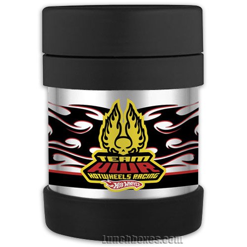 Join the Hot Wheels Racing Team with this cool (or is it HOT?) food jar. The front shows the Hot Wheels logo along with the caption "Team HWR - Hot Wheels Racing". The soup thermos is made of nearly unbreakable stainless steel with double vacuum insulation for maximum temperature retention. The extra wide mouth is easy to fill, serve from, and clean. It's light, compact, and portable. Great for taking anything warm like soup or cold like fruits to school, a picnic, or a field trip. Holds 10 Oz. (290 ml). Measures about 5" tall, and 3.5" in diameter. Shipping Weight: 2 lbs.