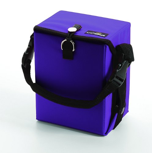 Here's the perfect lunch box for your little ones that need a few snacks at the park or a light midday meal at kindergarten. Adults appreciate this size lunch box for a midafternoon snack in between errands. With your box that folds flat to a placemat or sitting mat you receive: The box. It measures about 6" wide, 7.5" tall, and 4.75" deep - about the size of a small paper bag. Two 11 ounce food containers. Each container has two separate, removable trays that hold about 5 ounces each. One 1 ounce container. Good for salad dressing or dipping sauce. One 8 ounce drink bottle. Choose from screw-top or sippy style. One ice pack. Rigid, puncture-proof Carrier. Choose from handle or shoulder strap.
