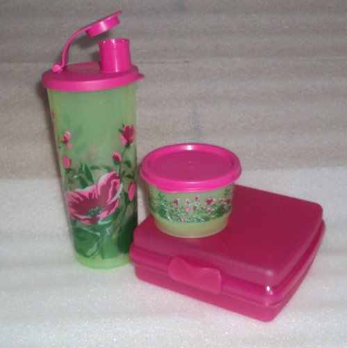 Tupperware Sandwich Keeper, Snack Cup, and 12 ounce Tumbler in pink and green flower design. Snack cup holds 4 ounces and has a virtually airtight, liquid-tight seal. Tumbler holds 16 ounces, also virtually airtight, and liquid-tight. Sandwich keeper is a one-piece hinged construction so you don't have to worry about losing parts!