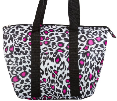 Keep food hot or cold till lunchtime with this reusable lunch tote! Eating out can be expensive and doesn't always provide the healthiest options. Save money and eat better by taking food from home! Made of hard wearing microfiber in trendy pink, white, and black lynx print with black shoulder straps, this lunch box features a zip top closure and three exterior pockets perfect for storing utensils, wet naps, or small snacks. The silver insulated interior is fully lined for easy cleanup of accidental spills and ensures against leaks. Makes a stylish school lunch box for small children, tweens or older! Use as a small cooler for summer picnics, to keep drinks cool at outdoor sports practices, or just to showcase your personality whenever you're taking food and drinks on the go.