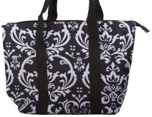 Keep food hot or cold till lunchtime with this reusable lunch tote! Eating out can be expensive and doesn't always provide the healthiest options. Save money and eat better by taking food from home! Made of hard wearing microfiber in trendy black and white damask print with shoulder straps, this lunch box features a zip top closure and three exterior pockets perfect for storing utensils, wet naps, or small snacks. The silver insulated interior is fully lined for easy cleanup of accidental spills and ensures against leaks. Makes a stylish school lunch box for small children, tweens or older! Use as a small cooler for summer picnics, to keep drinks cool at outdoor sports practices, or just to showcase your personality whenever you're taking food and drinks on the go.