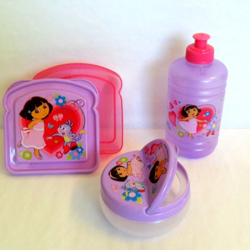 Perfect Dora the Explorer and Nick Jr school lunch set for your kids. Put their healthy snacks in a Dora the Explorer snack container they can't wait to open. Pull-top water bottle can be used for juice, milk, or drinks they can take to school with them. It comes with a handle for easy carrying. And the sandwich container can be used for sandwiches or for storing food at home. All containers are PVC and BPA free, and are freezer, microwave, and top-rack dishwasher safe. Ideal for the Dora fan in the house, these items are great for lunches, going to the pool, or even as party favors!