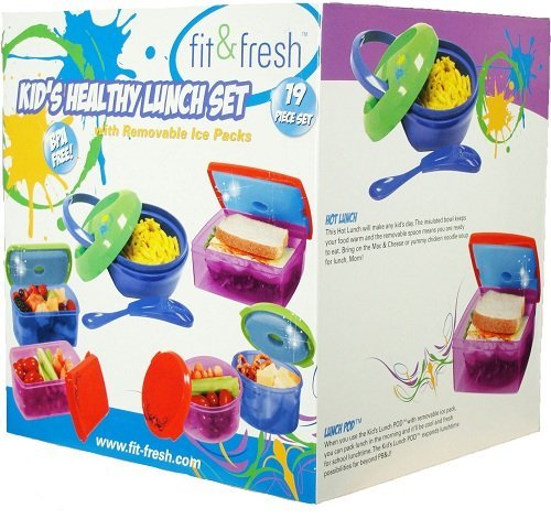 This lunch set includes: Kids Lunch POD - Red/Purple, Kids Hot Lunch - Blue/Green, 2 ea - 1 cup Smart Portion Containers - Red/Purple and Blue/Green, 2 ea - 2 cup Smart Portion Containers - Red/Purple and Blue/Green.Cool Possibilities Kids Lunch POD - Red/Purple: The Lunch POD can make any child want more than PB&J. Clip the ice pack into the lid and send them off with a healthy turkey & cheese on whole wheat.- Top Cover - provides a tight seal for freshness- Removable ice pack - snaps into the lid to keep food fresh and chilled until mealtime- Bottom Compartment - Holds up to 2.65 cups.Kids Hot Lunch - Blue/Green:The Hot Lunch Container is not only great for soup, but also healthy leftovers. The re-usable folding spoon snaps into the lid- no more lost silverware. Use the bottom compartment to send them off with a soup topping or side dish.- Carry handle in lid - easily take lunch with you- Snap in Spoon - unique re-usable folding spoon that snaps into the lid.- Soup Container - holds up to 14 oz of food.Two 1 Cup Smart Portion Containers:Easy to open, versatile and stackable Smart Portion Chill Containers include removable ice packs-Kid friendly sizes easily fit into most lunchboxes and bags.- Container - Includes measurement markings so you pack just enough.- Lid - large tabs on two sides for easy opening.- Removable Ice Pack - clips into the lid to keep food chilled and fresh.Two 2 Cup Smart Portion Containers:Easy to open, versatile and stackable Smart Portion Chill Containers include removable ice packs, so pack a lunch or snack confidently knowing it will be fresh and cool until mealtime.The 2 Cup Smart Portion Container is just the right size for pasta salad, or kid-friendly veggies.- Container - Includes measurement markings so you pack just enough.- Lid - large tabs on two sides for easy opening.- Removable Ice Pack - clips into the lid to keep food chilled and fresh.