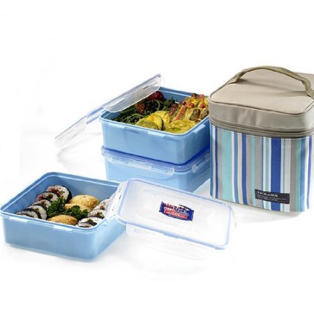 Lock & Lock Square Lunch Box 3-Piece Set with Insulated Stripe Bag, Blue